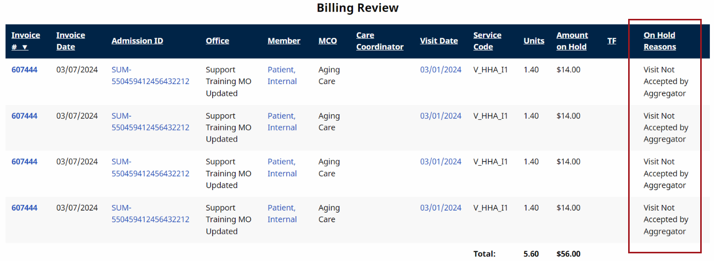 In the Billing Review, if Visit Not Accepted by Aggregator appears in the On Hold Reasons column, visits remain on hold until an Accepted status is received from the EVV Aggregation Transaction Manager.