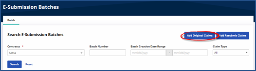 The E-Submission Batches page opens. Select all applicable Contracts and click the Add Original Claims button to create a new batch.