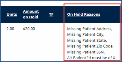On Hold Reasons are issues keeping the Claim from being submitted. The system holds these Claims because there is missing or incorrect information causing issues after the claim has been exported to a 3rd Party for review.