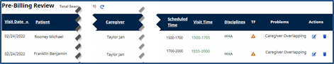 Caregiver Overlapping indicates that a single Caregiver has overlapping shifts. This usually occurs on linked cases where the Caregiver is working for multiple individuals in the same location, scheduled back-to-back. For example, Caregiver Jan Taylor is scheduled for Patient 1 from 1500 to 1700, then for Patient 2 from 1700 to 2000. Her confirmations overlap by ten minutes. |