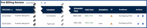 To correct both validation issues, click the Edit icon to open the visit details. On the Visit Info tab, manually adjust the Confirmed Times and save to eliminate the overlap.