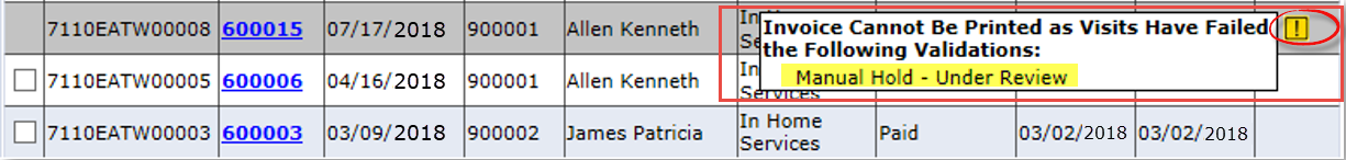 Visits held on the Billing Review Exception page cannot be included in the paper invoice. These visits display in grey. Hover over the Exclamation icon ! to see the hold reason.