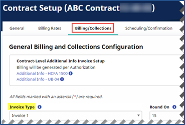 In the Billing/Collections tab, select the print format for the Contract from the Invoice Type field.
