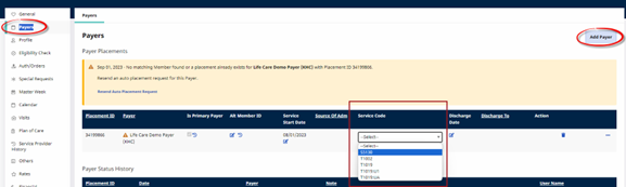 Confirm that the Payer is in the system with the proper Service Code. Click the Edit icon to add or edit the Service Code field.