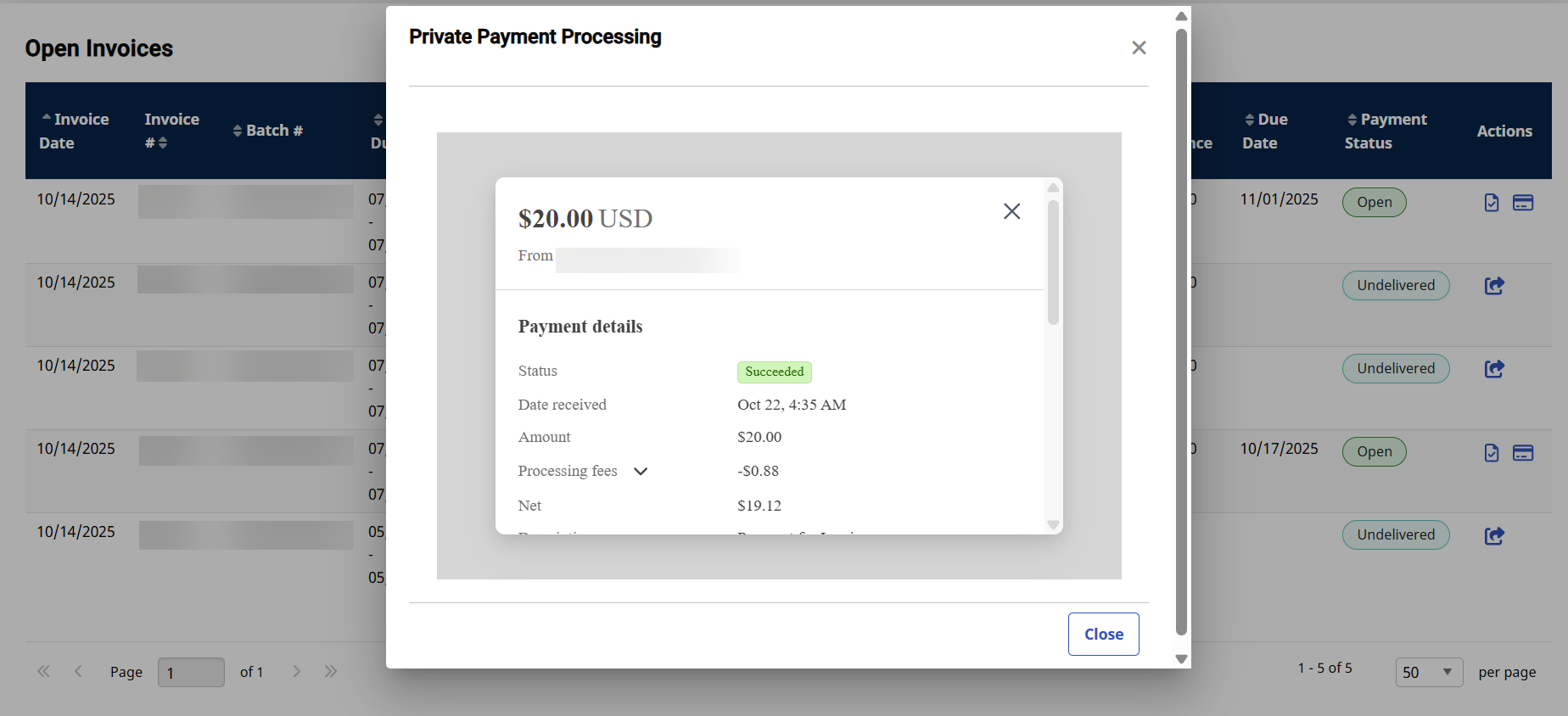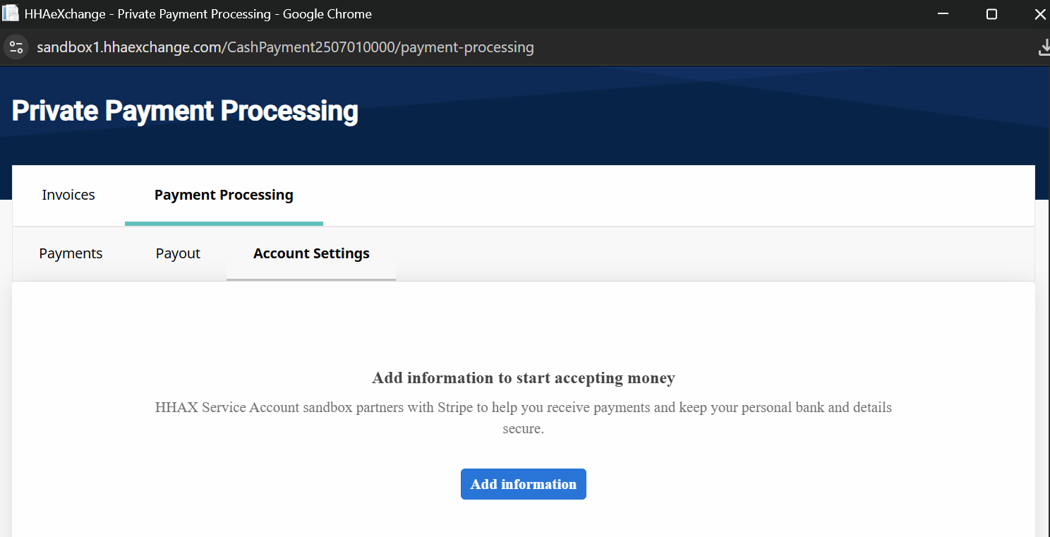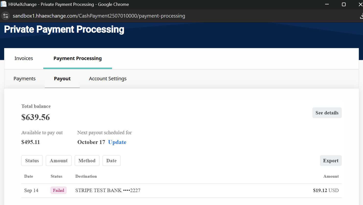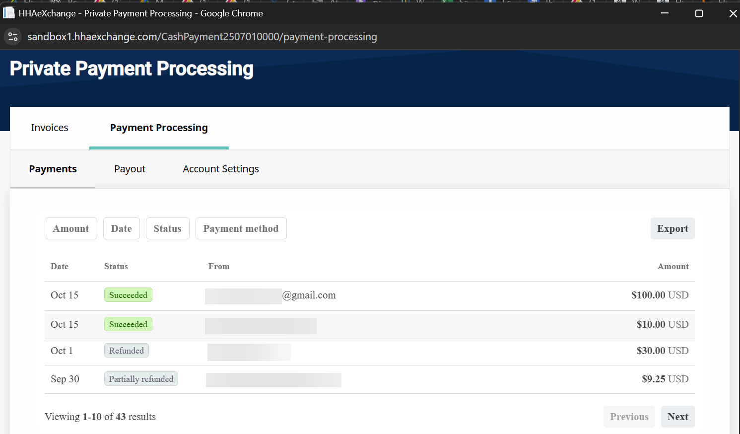 The Private Payment Processing feature under Billing > Private Payment Processing allows agencies to send and receive digital payments from patients or designated payers and manage all private payment activity in one place. This feature streamlines payment management with tools for invoicing, refunds, payment tracking, and account settings.