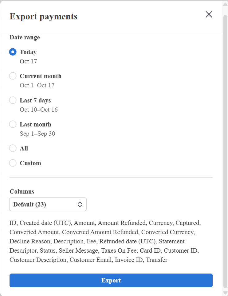 The Export button allows you to export payments based on the selections on the Export Payments window. Select the Export button. On the Export Payments window, select the Date Range and Columns fields, and then select Export.