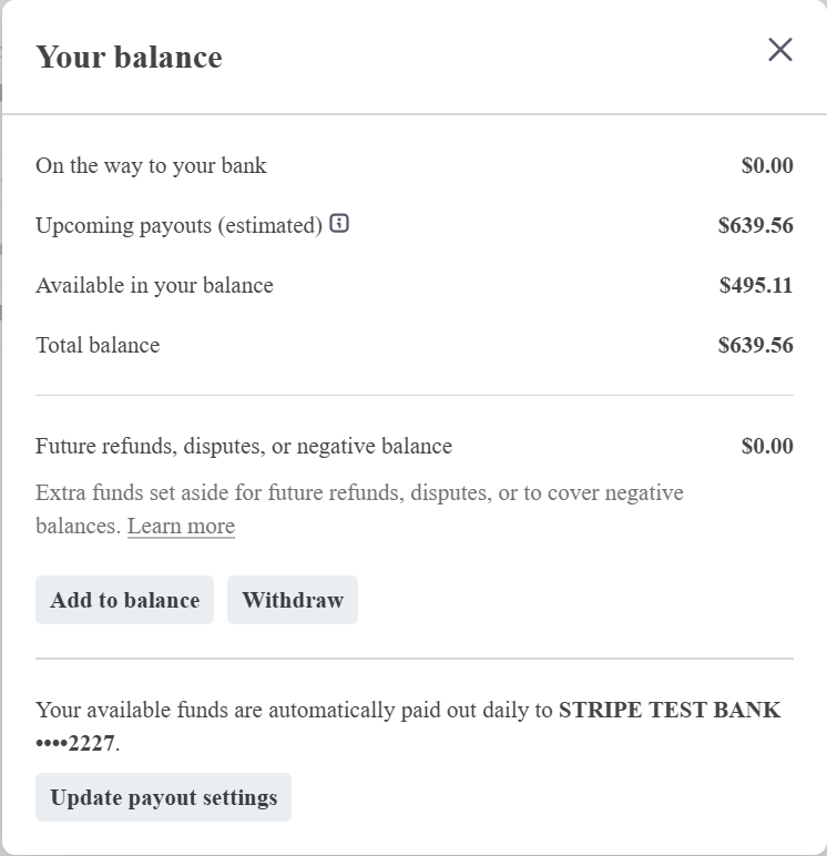 Select the See Details button to view more details about your payout balance. From the Your Balance window, you can add to your balance, withdraw funds, and update your payout settings.