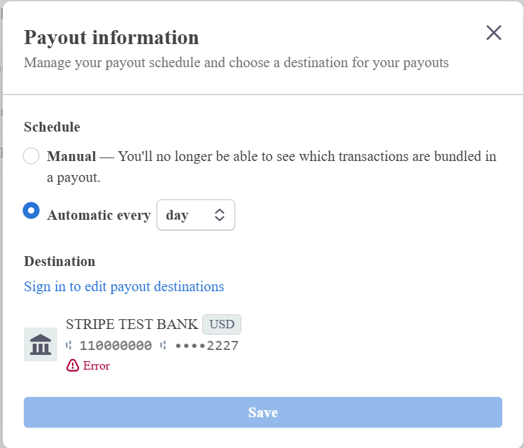 Select the Update button to open the Payout Information window. The Payout Information window allows you to manage your payout schedule and choose the destination for your payout.