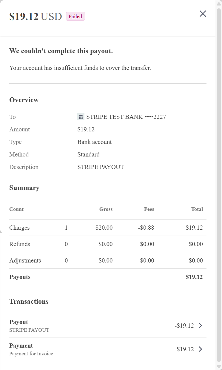 Select the payment from the Payout tab to review additional information about the payout. This includes the payment overview, summary, and transactions.