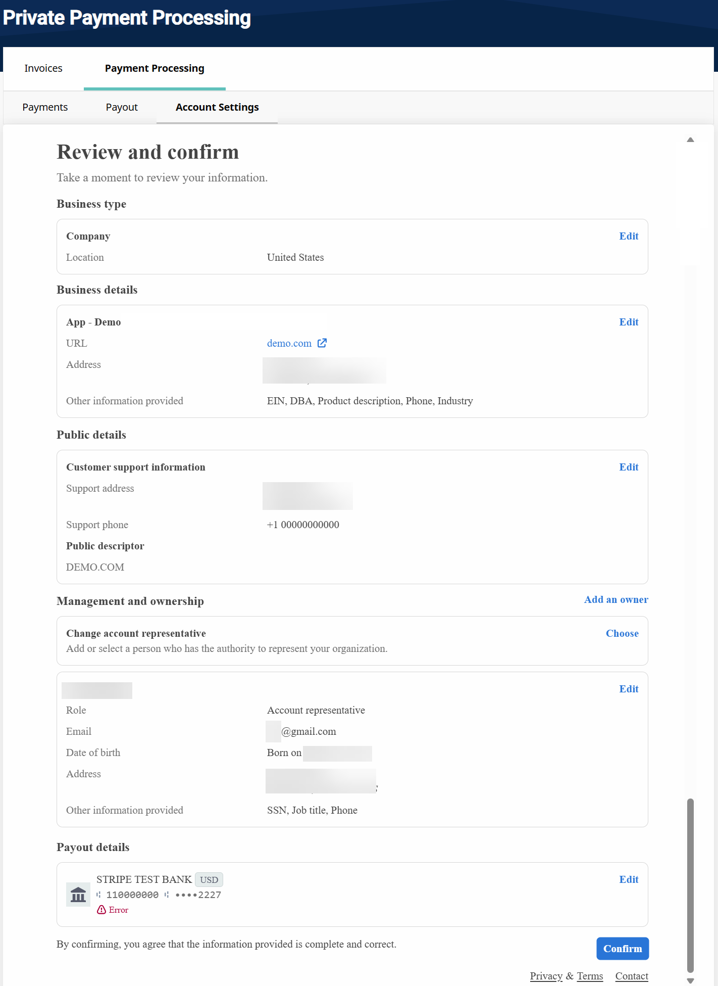 The Payment Processing tab includes information about Payments, Payout, and Account Settings.