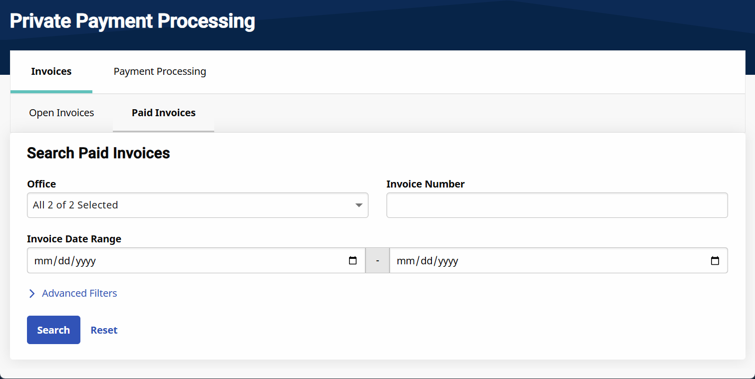 Search for paid invoices on the Paid Invoices tab. Enter search parameters and then select Search. Your paid invoices display.
