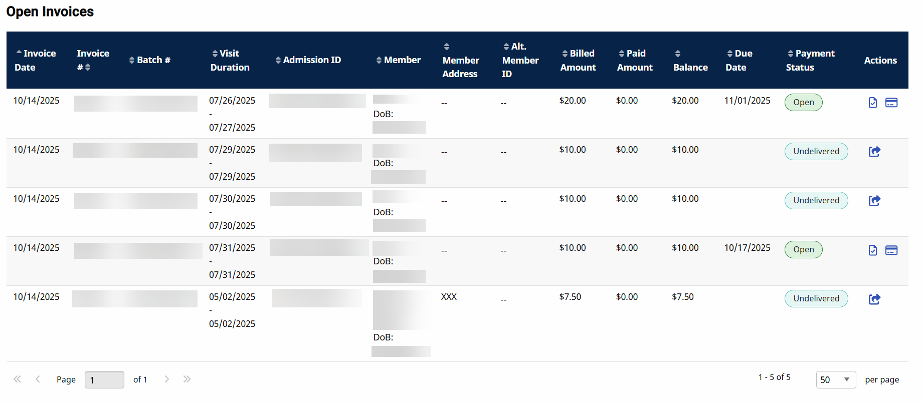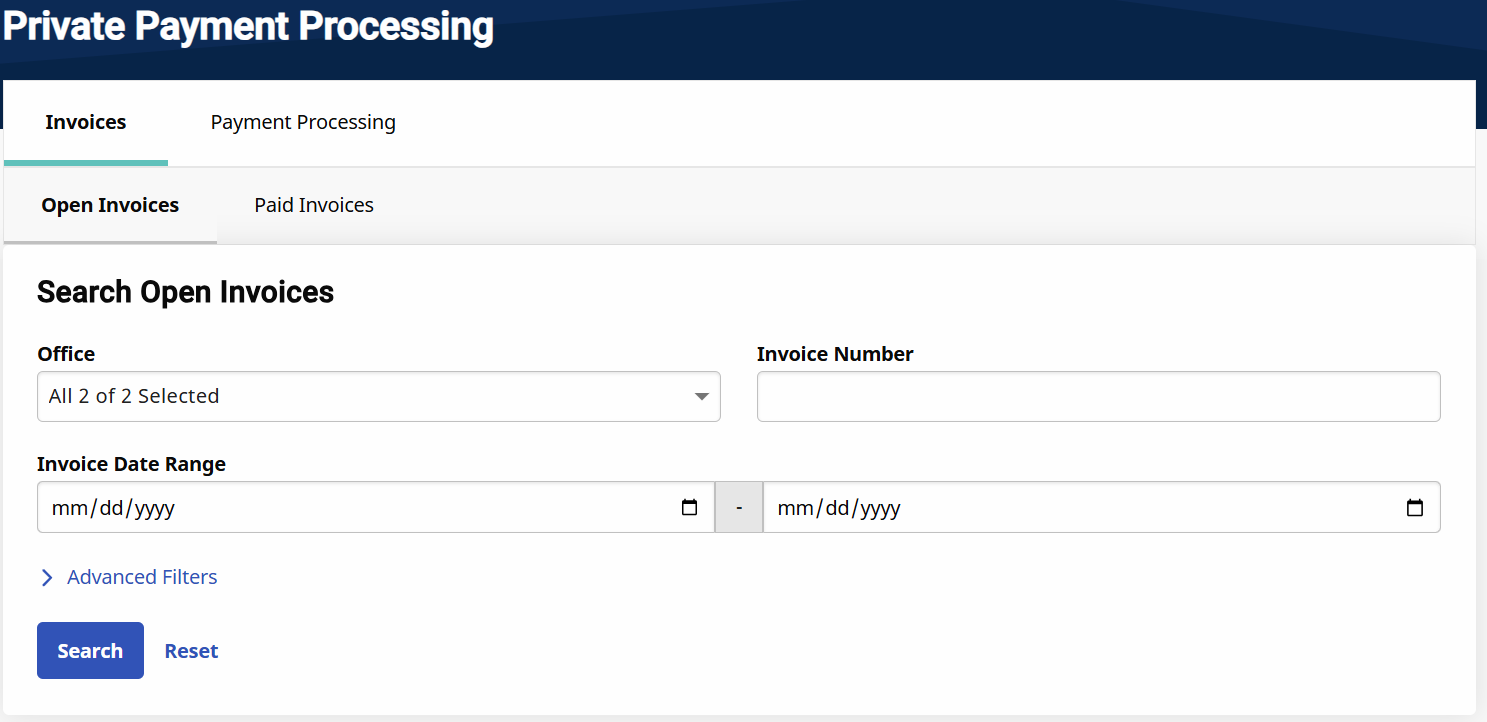 Search for open invoices on the Open Invoices tab. Enter search parameters and then select Search. Your open invoices display.