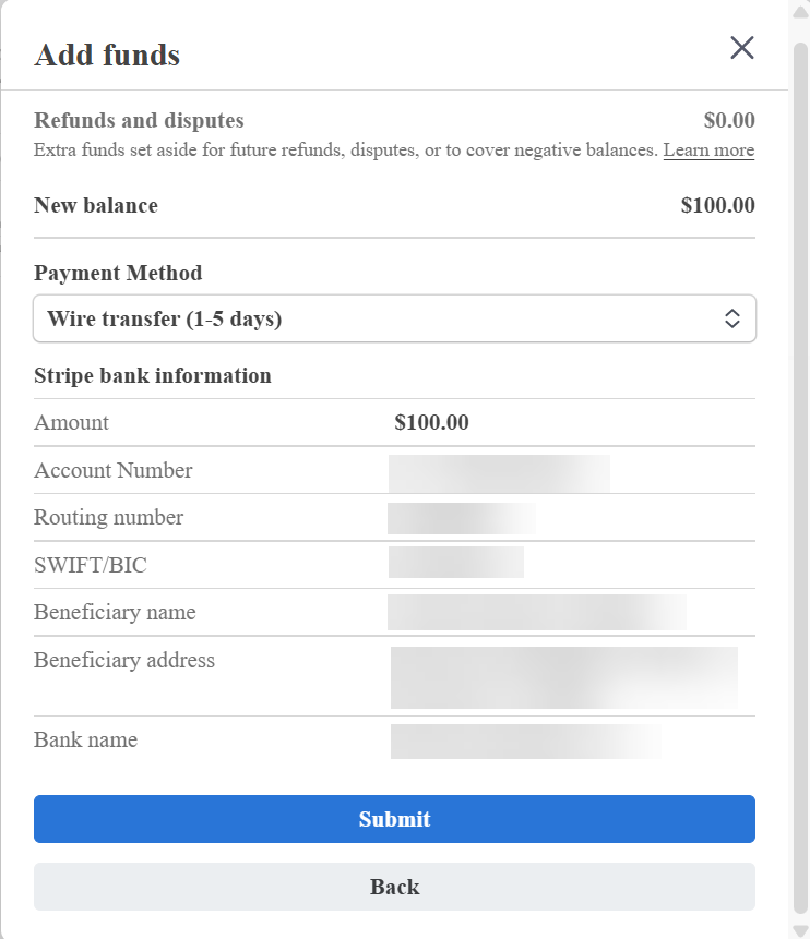 Select Add to Balance to cover negative balances. Enter the amount on the Add Funds window and then select Continue.