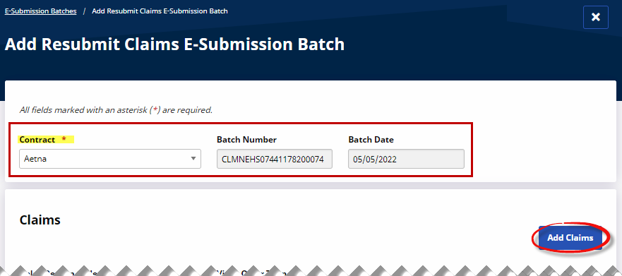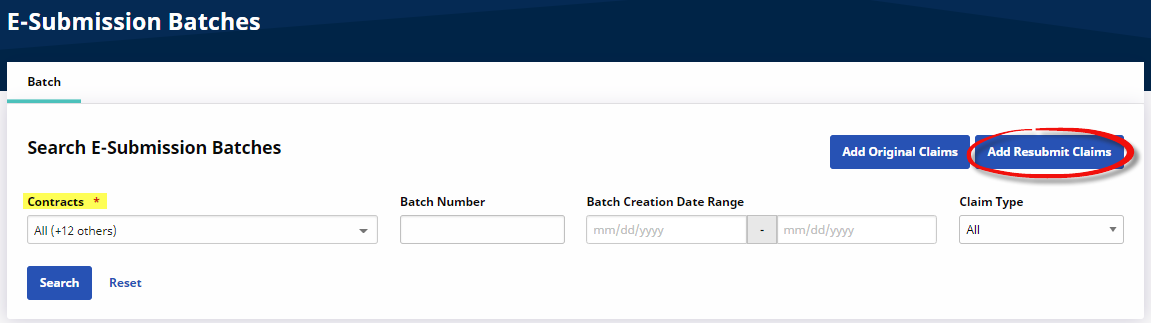 On the E-Submissions Batches page, select applicable Contracts and click the Add Resubmit Claims button.