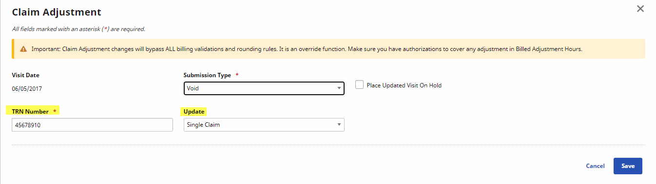 When Void is selected, the TRN Number is required. In the Update field, select whether to Void the selected claim, all the claims in the batch, or every claim within the batch with the same invoice number.