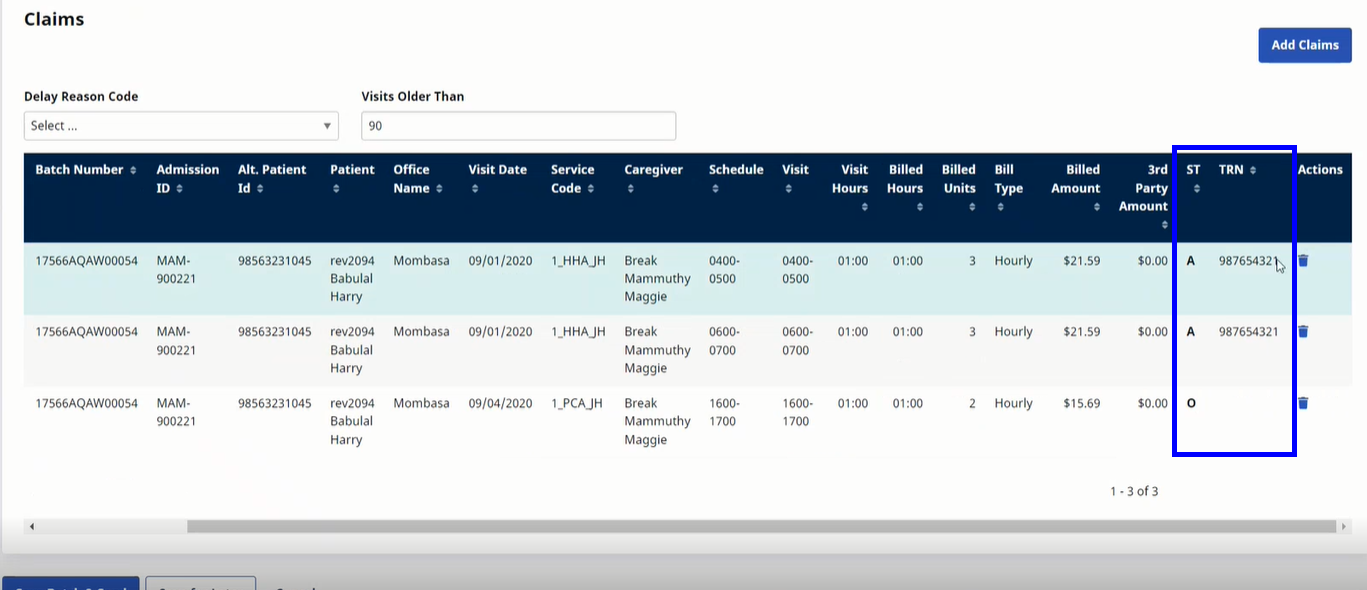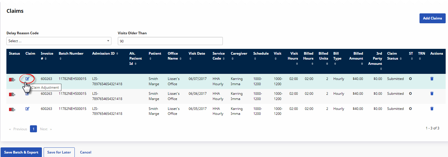 to open the Claim Adjustment window to make edits to each claim. To remove a visit from the batch, click the Delete icon