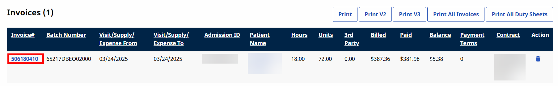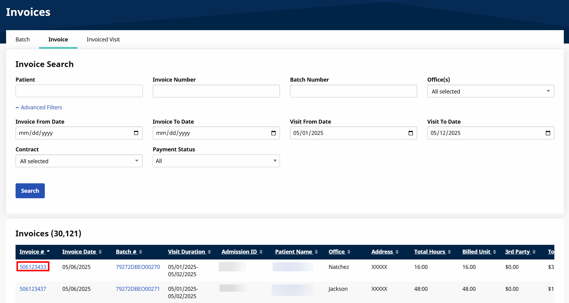 From this page, select individual invoices by clicking on the line in the Invoice # column to see the details of Visits included within that invoice.