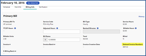 Once corrections have been applied to the visit(s), it can be re-billed. Refer to instructions in the Rebilling - Resubmission and Adjustments topic. The new invoice details and the Deleted Invoice Number display on the visit’s Billing Info tab.