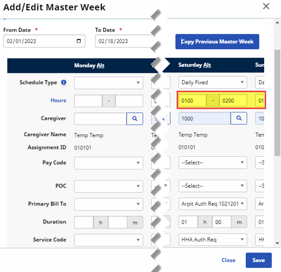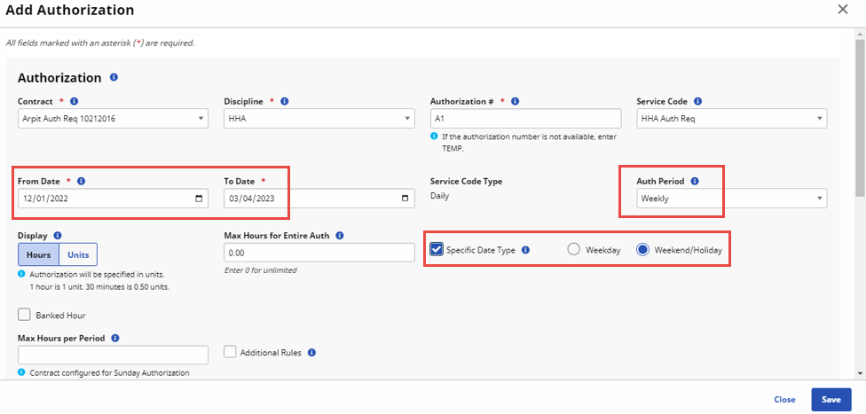 Upon Master Week rollover, the Authorization is only applied to visits according to the selected Specific Date Type field type (Weekend).