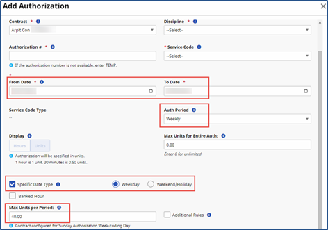 Auth 1 has been created with a WeeklyPeriod and 40 Max Unit per Period for a specific month. The Specific Date Type is checked with the Weekday radio button selected.