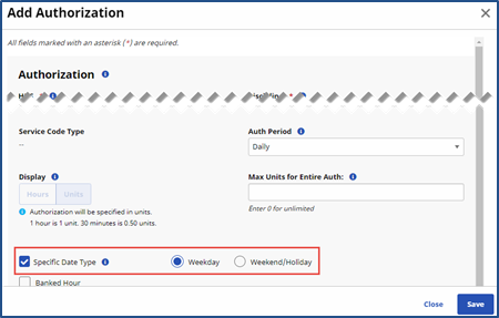 In the Patient Authorization window, the Specific Date Type checkbox (below the Max Unit for Entire Auth field) allows one to create Weekend, Weekday, and Holiday Authorization limits. This checkbox is only visible if the Period type selected is Daily or Weekly. The option hides if any other Period type is selected (such as Monthly or Entire Period).