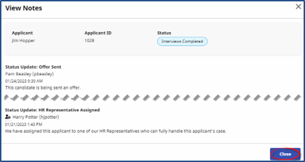 Select View Notes from the Actions column to observe the tracked notes across different Status updates corresponding to the Applicant. Click Close.