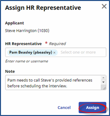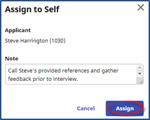 Select the Assign HR Representative option to open the Assign HR Representative window. Select the HR Representative (top image) to assign to an HR Representative to the Applicant or Assign to Self (bottom image) to assign the applicant to yourself. Include a supporting a Note (optional) and click Assign to finalize.