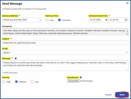 Select the delivery method for the message from the following options: Mobile App and Text (SMS), Mobile App Messaging, Email, and Text (SMS). |
