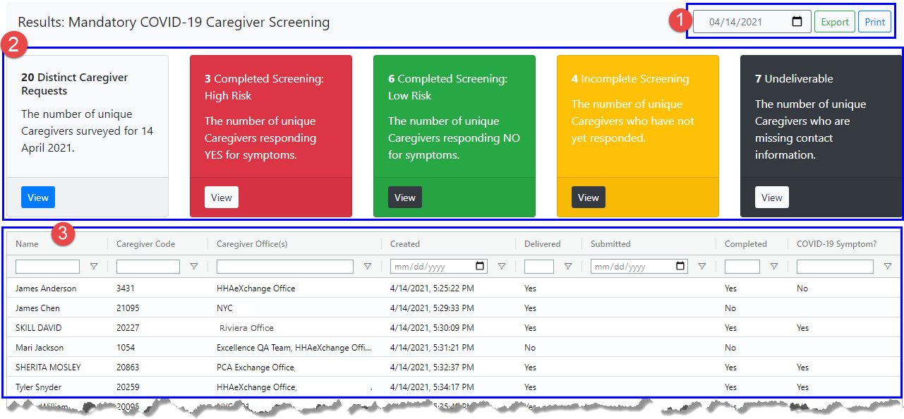 Search for COVID-19 response results by a specific date (defaults to the current date). Click the Export button to generate an Excel spreadsheet file for the selected date. Click the Print button to print the results for the selected date. |