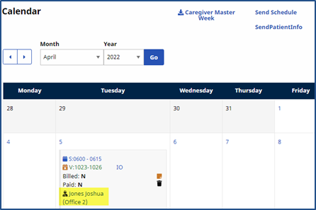 If the Caregiver is assigned to any Secondary Office, the 3-character Office Code appears after each Patient’s name for the Caregiver’s visit.
