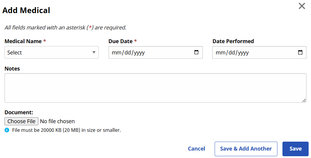 Complete the necessary fields when the Add Medical window opens. Fields marked with a red asterisk are required.