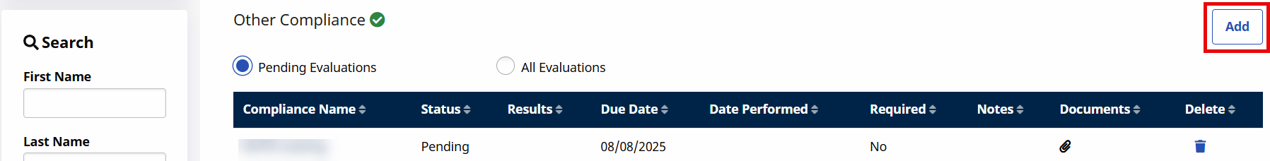 Based on the Compliance Setup, if a required Medical item is saved with a non-accepted Result, the Caregiver shows as Not Compliant. The same applies if a set due date for a given required Medical item has passed but no Result values have been saved.