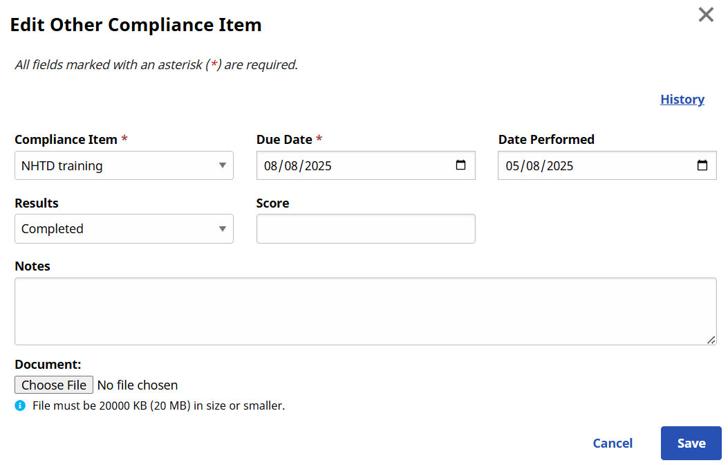 To edit a medical or other compliance item, go to the Medicals/Other Requirements tab under Caregiver > Search Caregiver > Compliance. When editing a medical or other compliance item (whether added automatically or manually), a Results value must be entered if a Date Performed has been entered or vice versa, to save the edit.