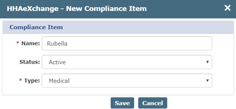 The HHAeXchange- New Compliance Item window opens. Complete the required fields (denoted with a red asterisk).