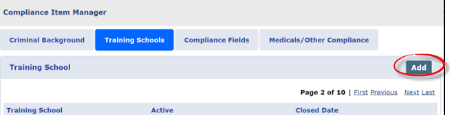 Agencies can setup and manage the values for approved Training Schools via the compliance Item Manager. Complete the following steps to add a Training School.