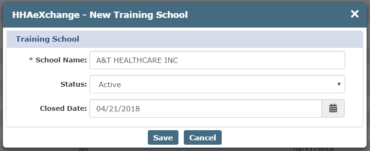 The HHAeXchange-New Training School window opens. Complete the required fields (denoted with a red asterisk).