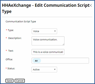 To edit a Script, click the Edit link from the existing script in the Reference Table. The Edit Communication Script Type window opens. Select or enter required fields (denoted with a red asterisk).
