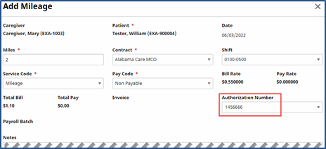 When creating a Mileage Event, the Authorization Number is displayed in the dropdown field if an Authorization(s) exists for the selected Patient, Contract, Service Code and Mileage Date.