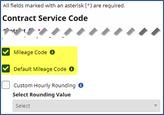 The Contract Service Code window opens. To associate a Contract with Mileage, two fields titled Mileage Code and Default Mileage Code are displayed in the Contract Service Code window. Complete the required fields as described in the table below. The Mileage Code checkbox must be selected to enable the Default Mileage Code checkbox.