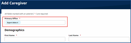 When creating a New Caregiver under Caregiver > New Caregiver, select the Primary Office from the dropdown menu listing the various Offices for an Agency. The functionality of this page remains the same.