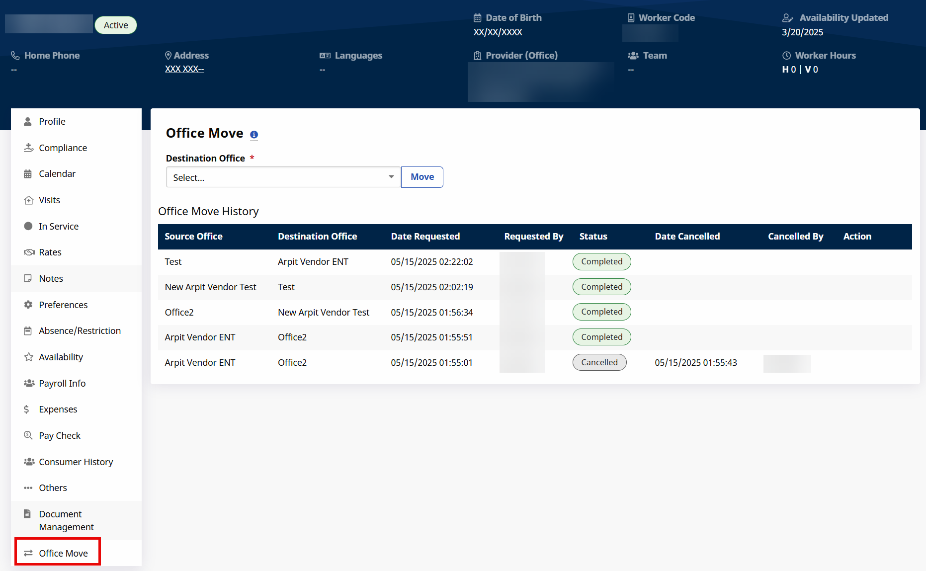 Go to Caregiver > Search Caregiver > Office Move tab.
