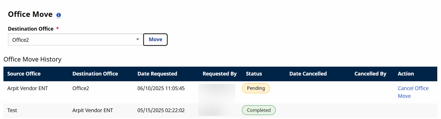In the Destination Office dropdown select the new office and then select Move.