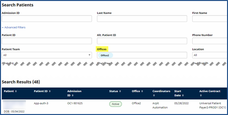 The system allows users to search for Patients in all Offices (Primary and Secondary) a Caregiver is assigned to, based on their access rights.