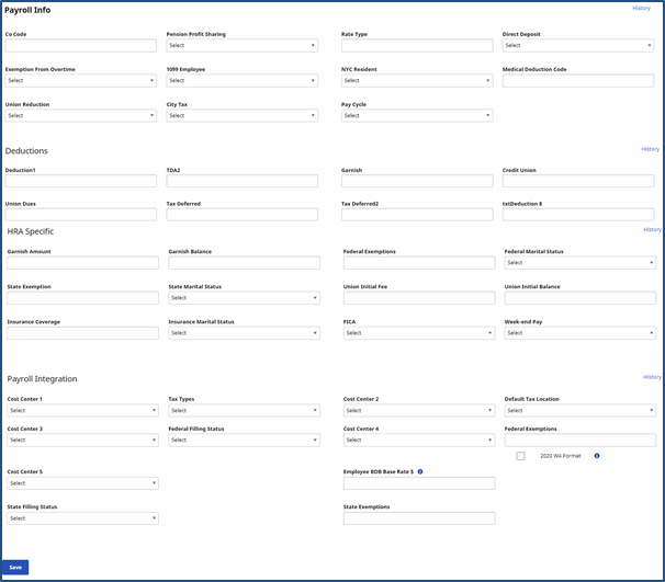 The Payroll Info page houses a Caregiver’s Payroll information to include basic details, deductions, and tax integration information.