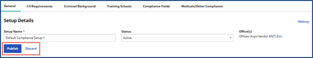 The Publish button becomes available once a change has been saved in any of the Compliance Setup tabs. The Discard button allows one to delete any saved changes which have not been published. These buttons are available to the user who made the changes on a given Compliance Setup.