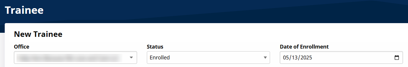 In the top section, select the applicable Office and the Status for the Trainee. The Status field allows an Agency to track the Trainee’s progress from start to finish as well as their success/completion of a certificate program. Select the Date of Enrollment.