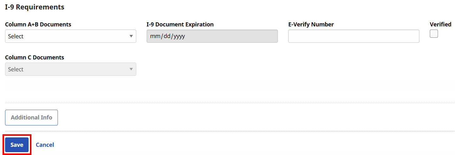 The last section is where I-9 documentation is noted. Select the identification presented as well as expiration date and if the documentation was verified.
