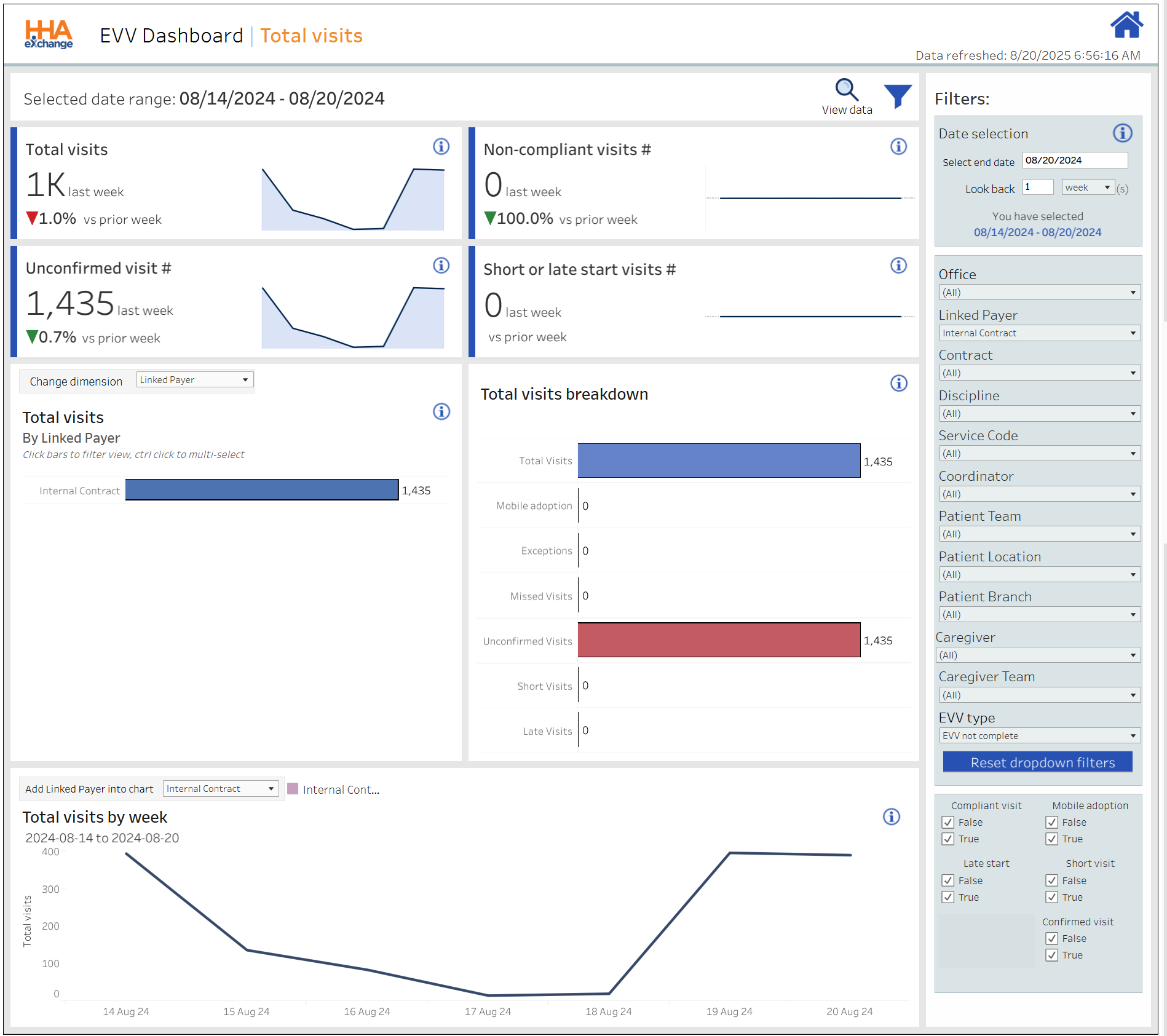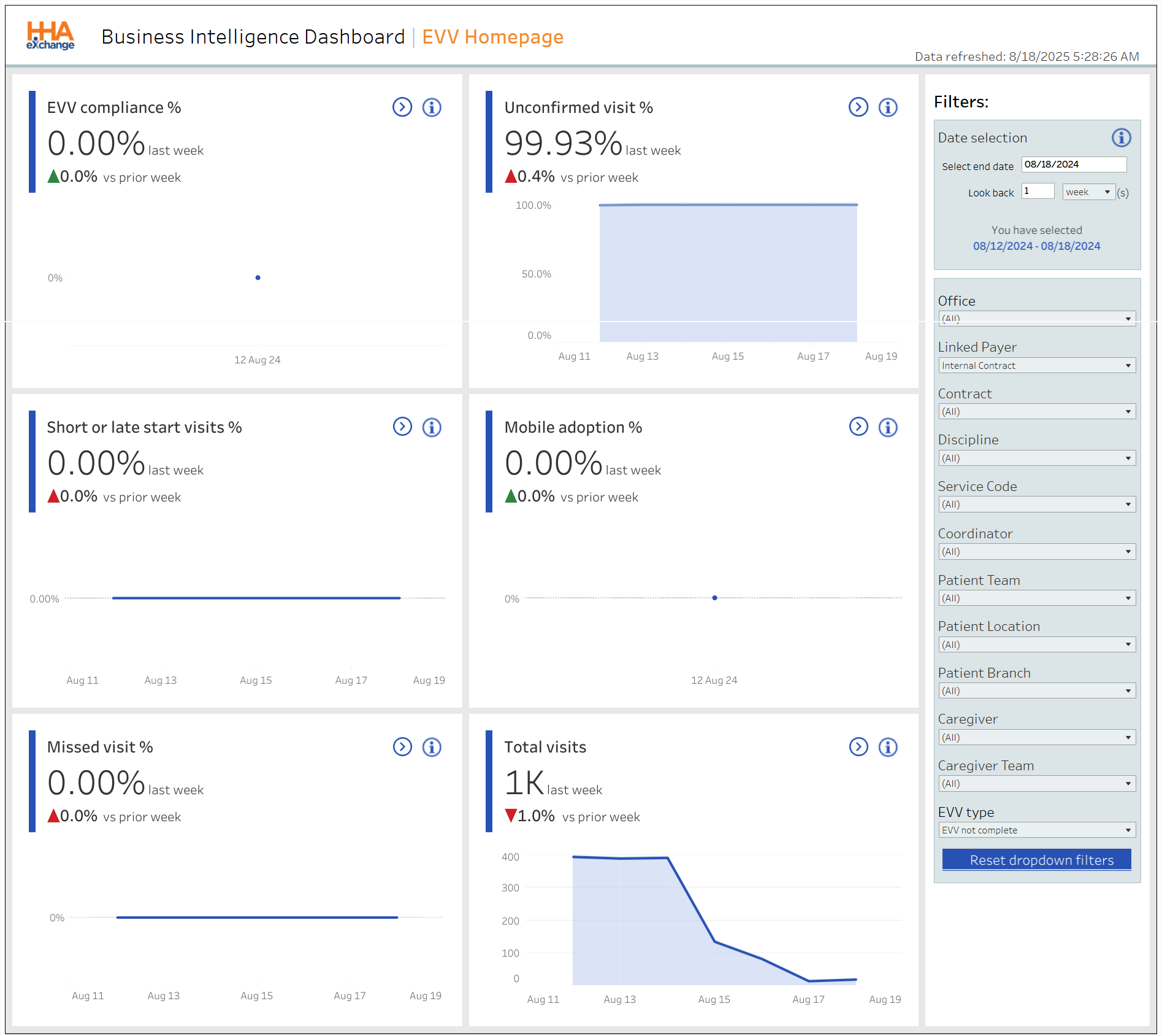 Percentage of EVV-compliant visits (Confirmed, excluding Exceptions) for the week in comparison to the prior week. |
