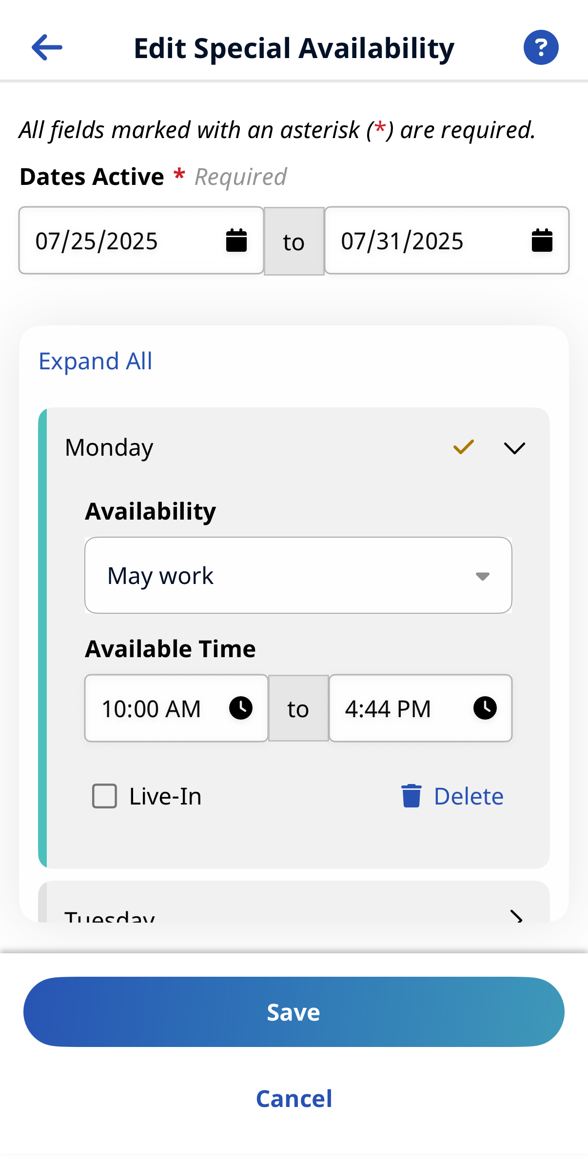 To add Special Availability, from the Special Availability tab, tap Add Special Availability. On the Add Special Availability page, expand the weekday to be added. Make entries and tap Save.