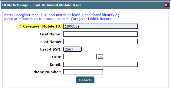 The Find Unlinked Mobile User window opens. Enter the Caregiver Mobile ID, required as denoted with a red asterisk, along with one or more identifying details such as First Name, Last Name, Last 4 digits of SSN, DOB, Email, or Phone Number. Click Search to continue.